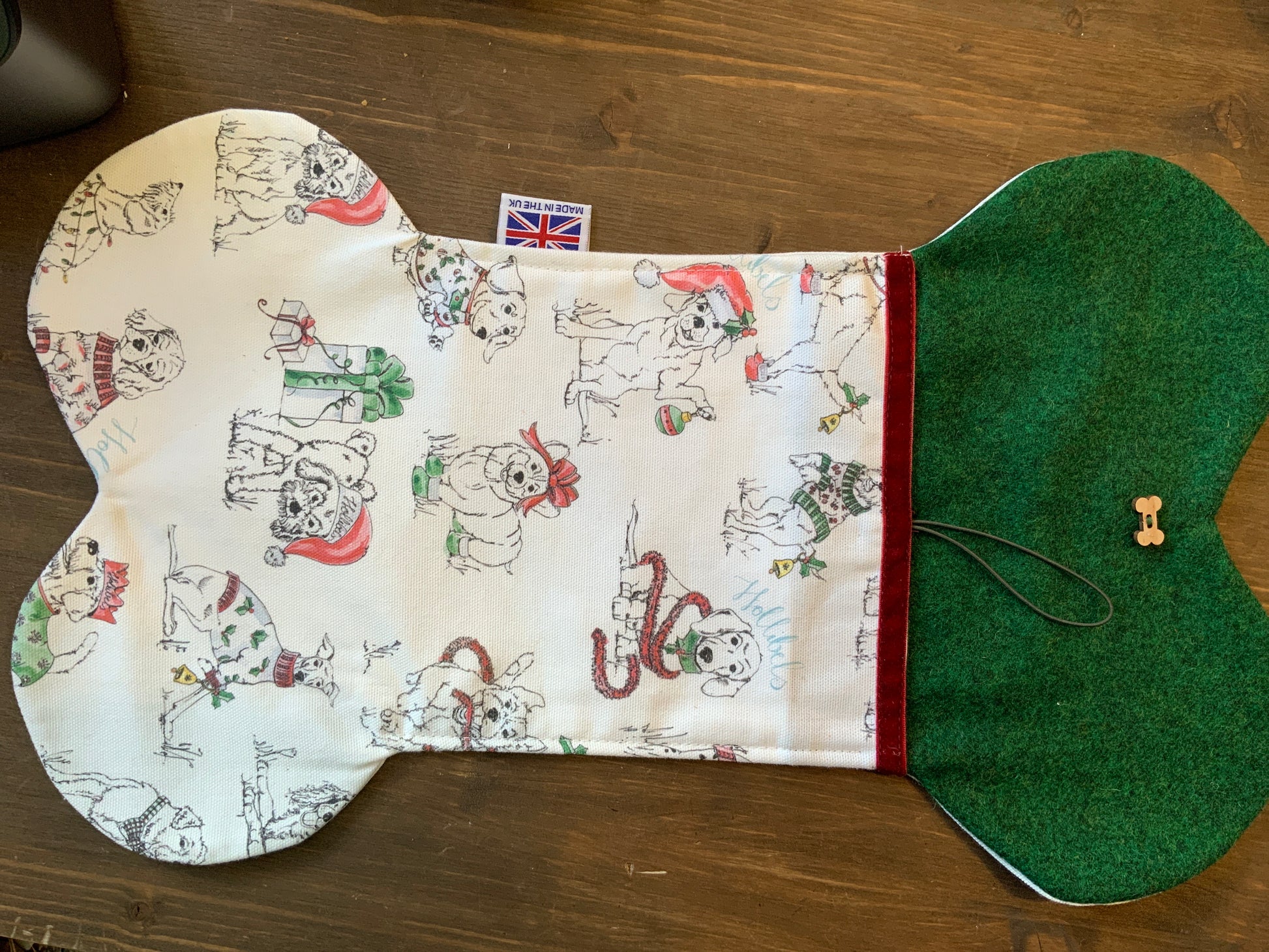 Make your pup part of the holiday magic with this handmade Dog Christmas Stocking, crafted from soft apple green wool and Hollibelsâ exclusive festive dog print fabric. Perfect for hanging by the fireplace or under the tree, this beautifully designed stocking is ideal for holding dog treats, toys, and Christmas gifts for your four-legged friend.