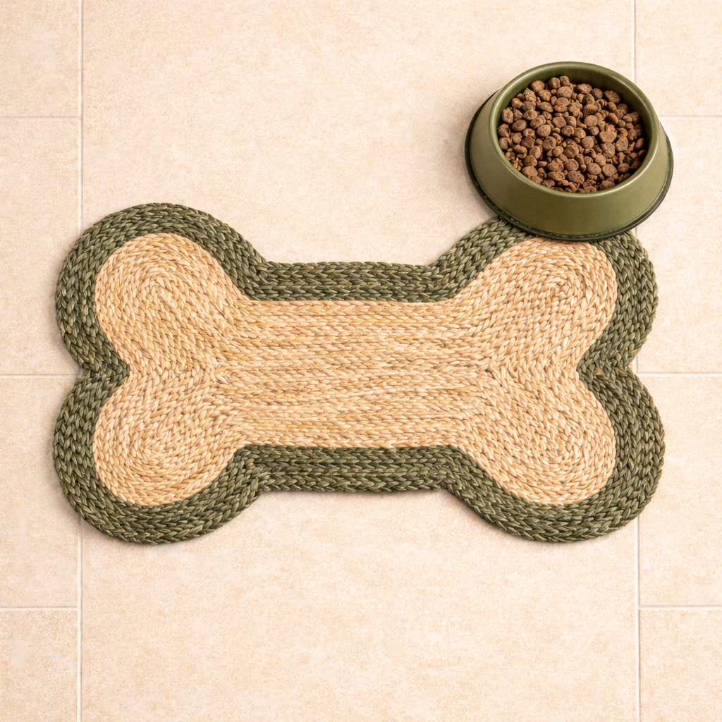 A thoughtful blend of form and function, this bone-shaped dog bowl mat brings quiet elegance to everyday rituals. Crafted from natural jute, it offers a beautifully textured foundation for food and water bowls while helping protect floors from spills. The sculptural bone silhouette adds a subtle design detail without overwhelming the space.