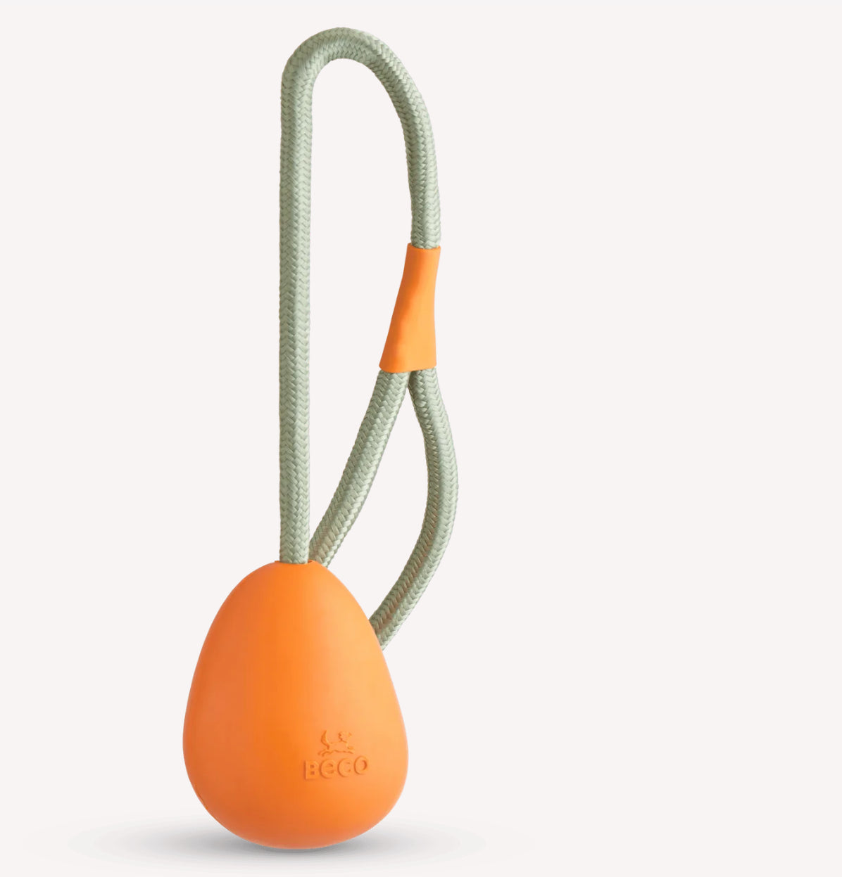 A natural rubber egg on a strong recycled rope. The springy natural rubber ball is easy for your dog to grip and the rope gives you extra throwing distance. Ideal for a game of fetch. The rubber has a gentle vanilla scent.